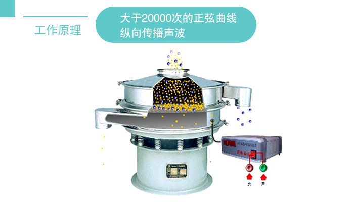 超聲振動波是一種大于20000赫茲的振動波,在超聲波振動篩中,我們一般使用在30000-40000赫茲之間的頻段。其振動特點為:使網絲在很小的振幅下,產生一個穿透能力很強、大于20000次的正弦曲線縱向傳播聲波,彈開粘附于篩網的物料,