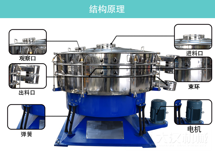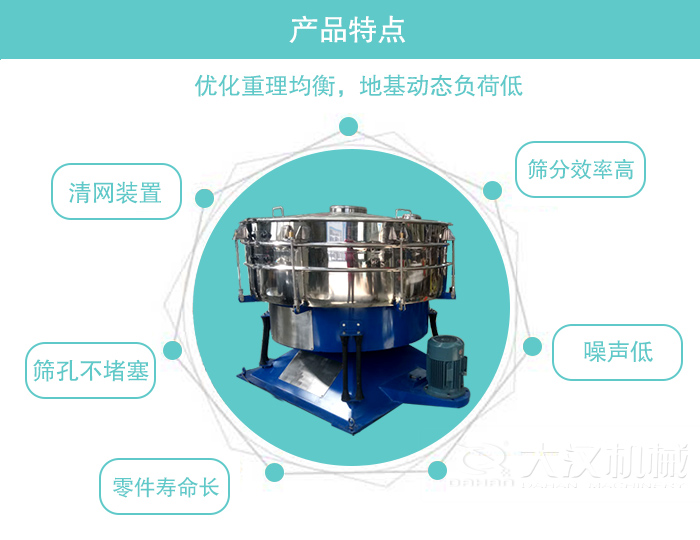 旋振篩,其原理是:瞬時運動為沿徑向的位移和以此位移為軸的圓周運動的合成(螺旋運動)。即可調(diào)節(jié)偏心距的激振器產(chǎn)生了非線性三維運動,物料也產(chǎn)生同樣的近似手動作業(yè)的運動,從而達到篩分之目的,再配合篩分附件可得到更加理想的篩分效果;適合于圓球狀、圓柱狀、片狀、乃至不規(guī)則形狀易堵網(wǎng)且需要精密篩分的物料。