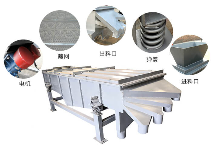 1030四層直線振動篩主要由篩箱、篩框、篩網(wǎng)、振動電機(jī)、電機(jī)臺座、減振彈簧、支架等組成。